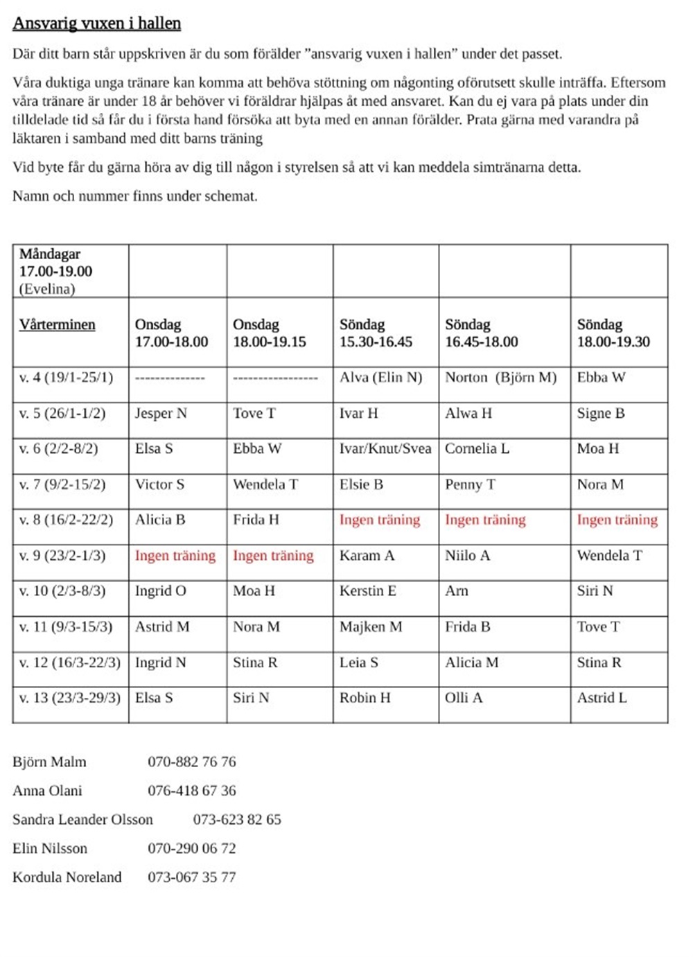 Här kommer schema över vuxen i hallen. Ett infoblad om vad som gäller när man är vuxen i hallen kommer inom kort....